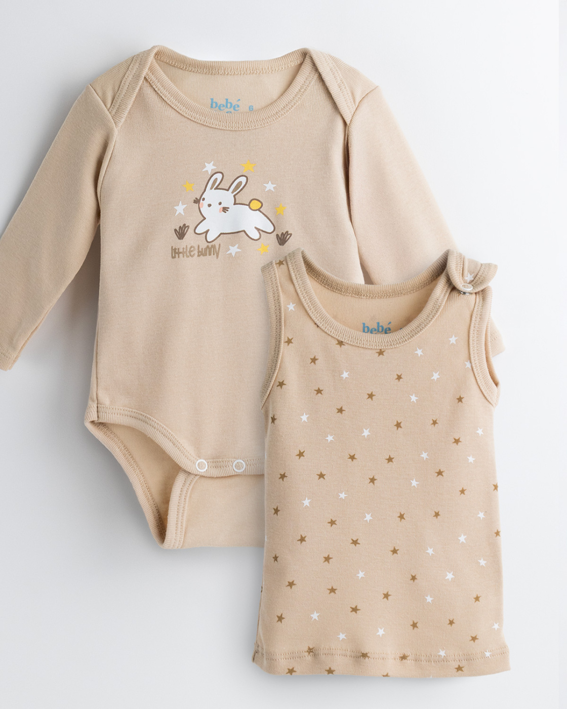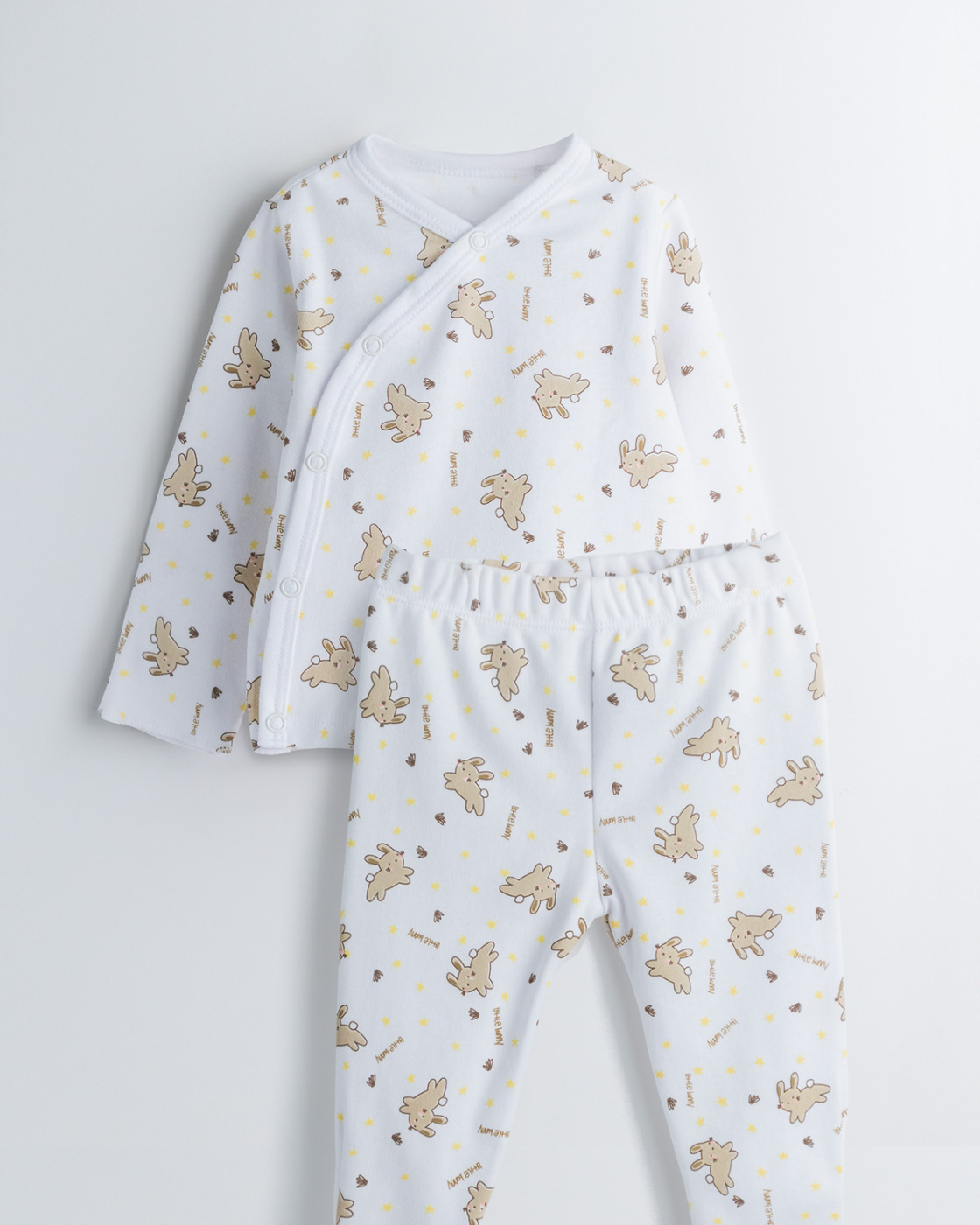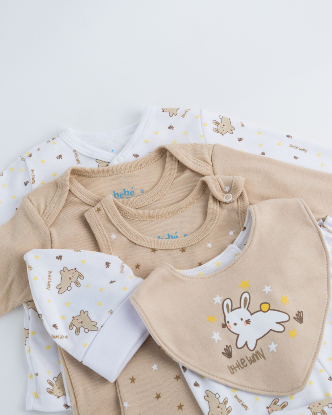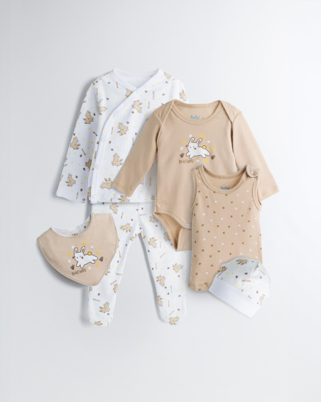 Ajuares de bebé niño de 6 piezas, en suaves tonos pastel. Incluyen body manga corta, buzo, pantalón con pies, babero y gorro. Perfectos para los primeros meses del bebé.