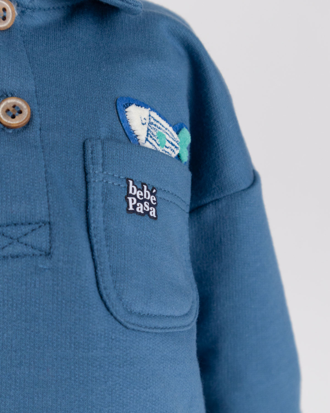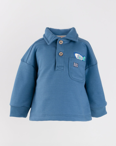 Sudadera polo para bebé niño combina la calidez de una sudadera con el estilo clásico de un polo. Ideal para salidas casuales, brinda abrigo sin limitar el movimiento. Su tejido suave cuida la piel delicada del bebé.