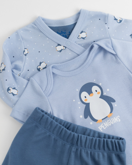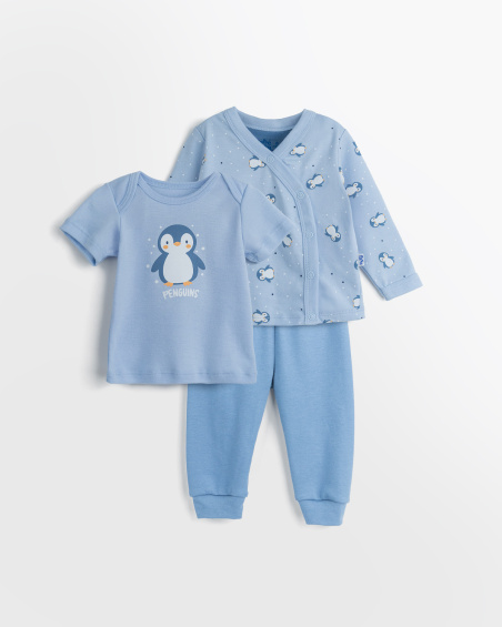 Conjunto de 3 piezas para bebé con camiseta, casaca cruzada y pantalón. Suaves, ligeras y cómodas para acompañar cada movimiento.