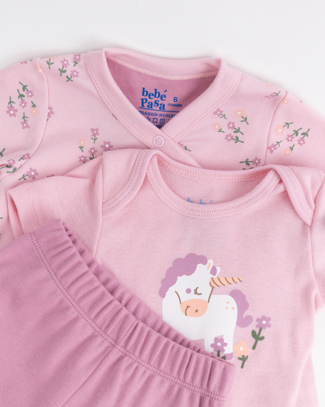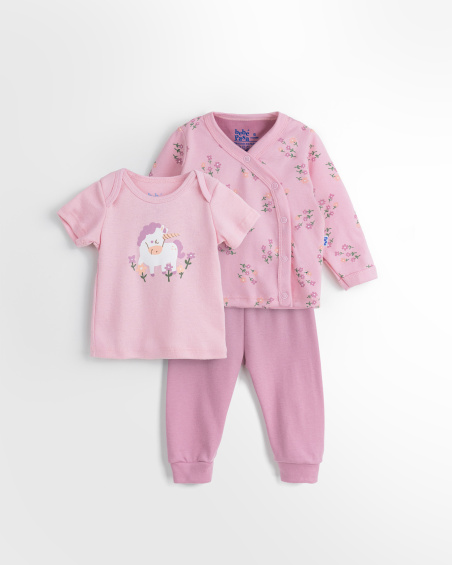 Conjunto de 3 piezas para bebé con camiseta, casaca cruzada y pantalón. Suaves, ligeras y cómodas para acompañar cada movimiento.