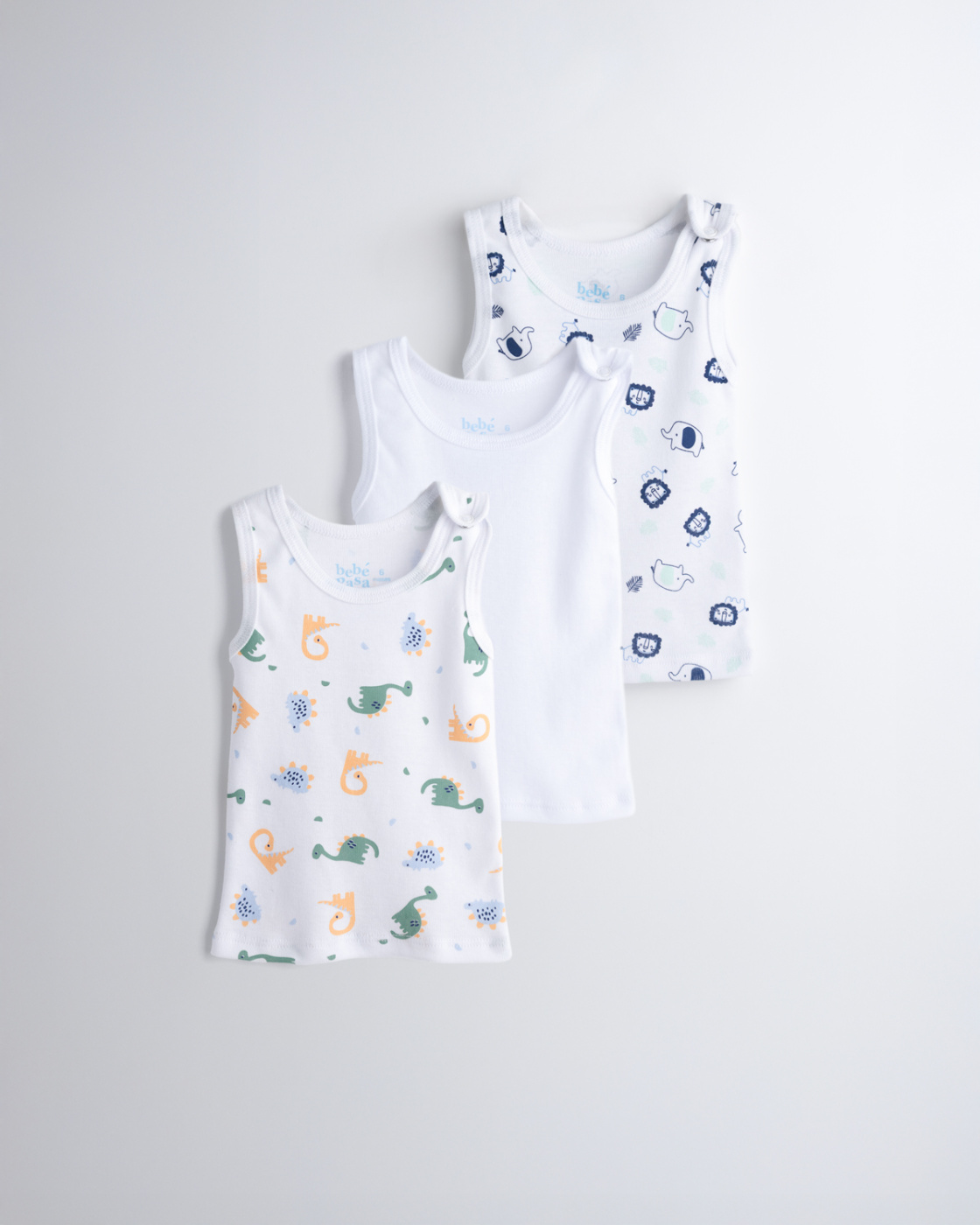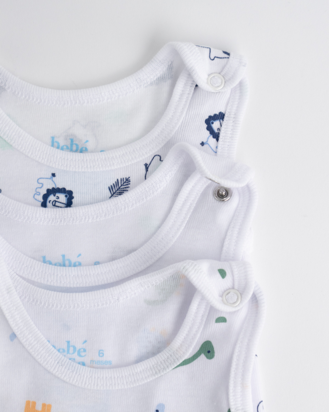Pack de 3 camisetas sin manga para bebé, suaves, frescas y coloridas. Ideales para días cálidos, su diseño brinda libertad de movimiento en cada momento.