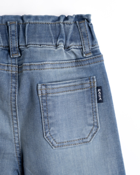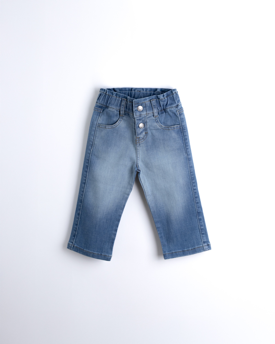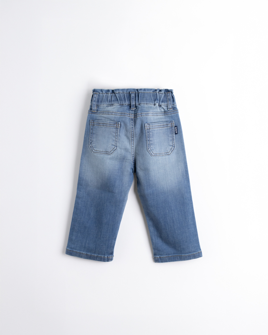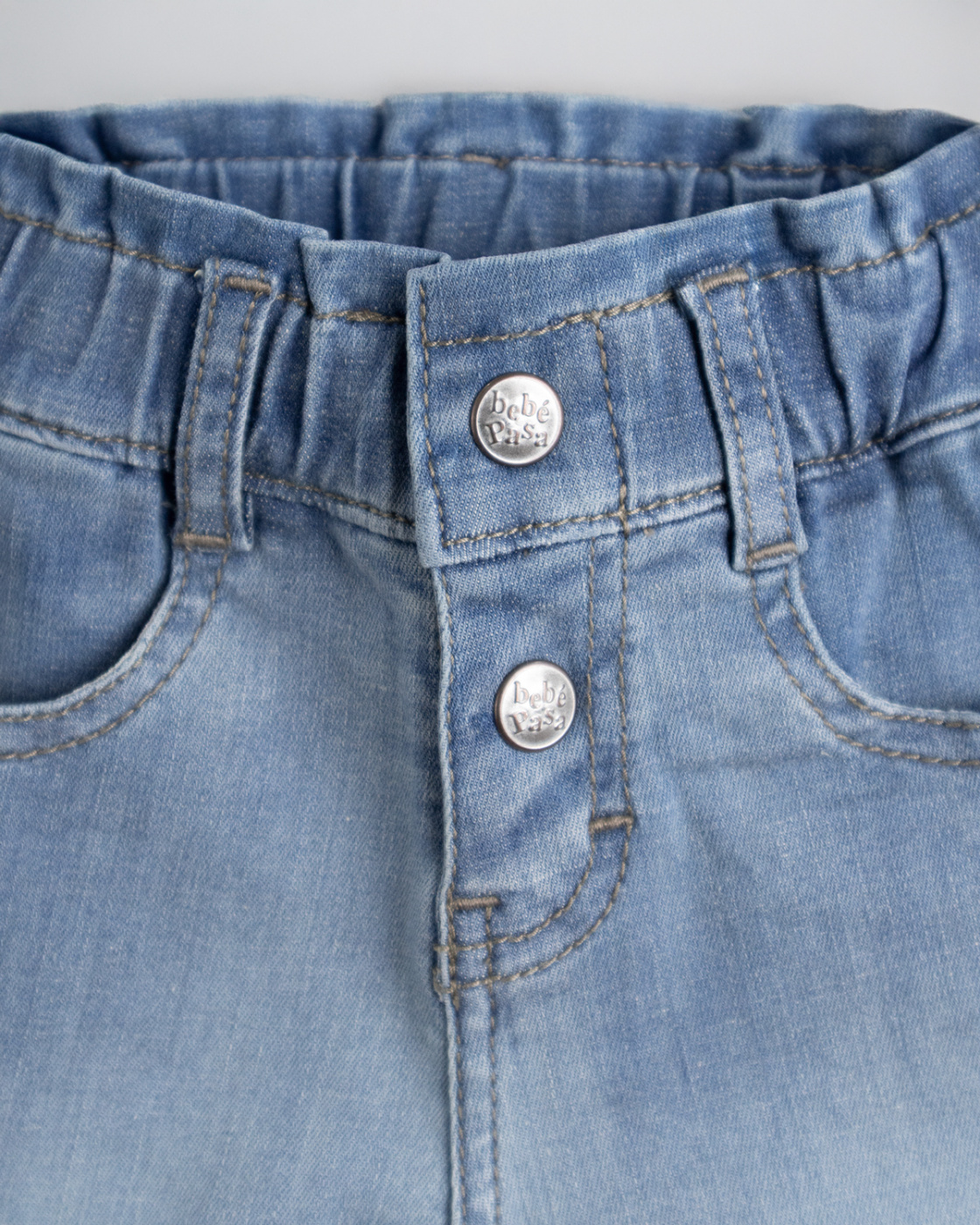 Pantalón de mezclilla azul claro con basta ancha y cintura elástica. Su tela suave permite libertad de movimiento y gran comodidad.
