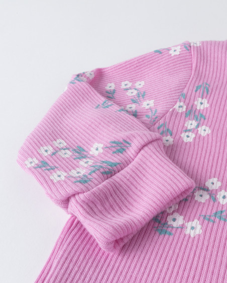 Pijamas de bebé niña en tela rib acanalada, disponibles en colores rosa y coral. Perfectas para ofrecer una noche de sueño confortable y fresca a tu pequeña.