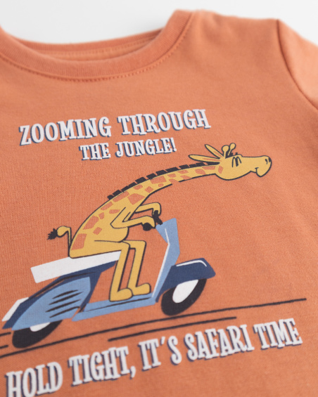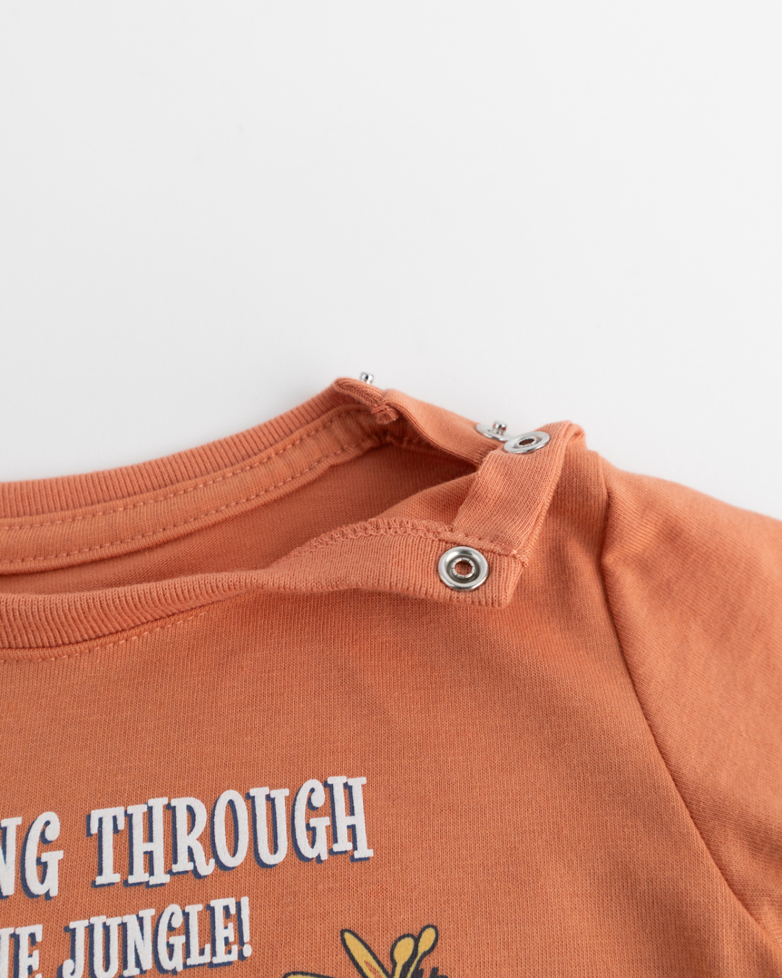 Esta camiseta de bebé niño combina suavidad y durabilidad. Su composición es 65% algodón y 35% poliéster. Cada camiseta viene en un color diferente, con estampados que pueden variar, asegurando que cada pieza sea única. Una prenda práctica y cómoda, perfecta para las actividades diarias de tu pequeño.