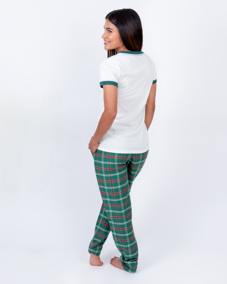 Celebra la magia de la Navidad con esta pijama para mujer compuesta por una camiseta blanca de manga corta con detalles verdes y un pantalón a cuadros tradicionales.  Ideal para disfrutar de una gran navidad con toda la familia, disponible en tallas S, M, L y XL.