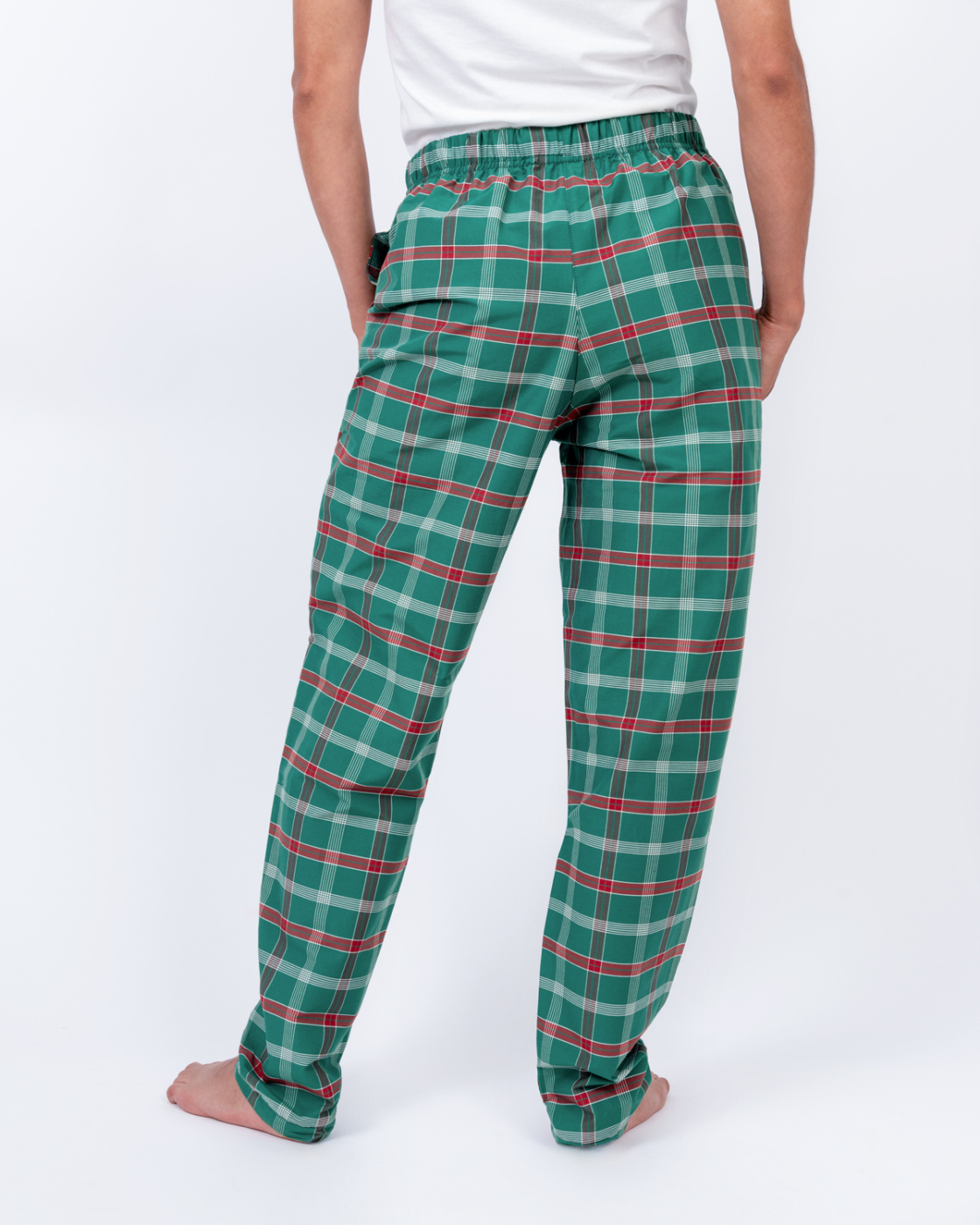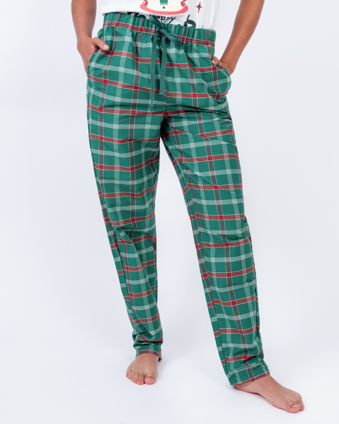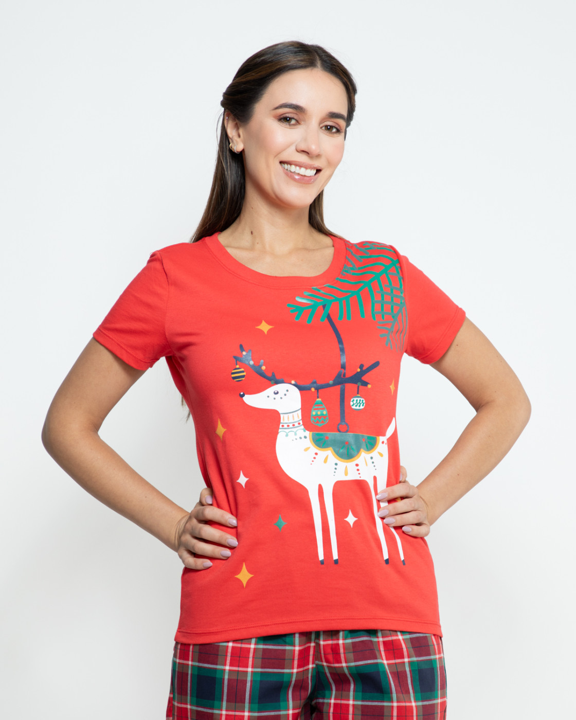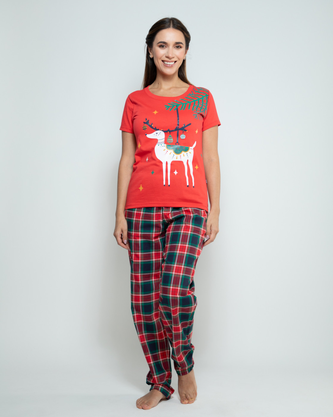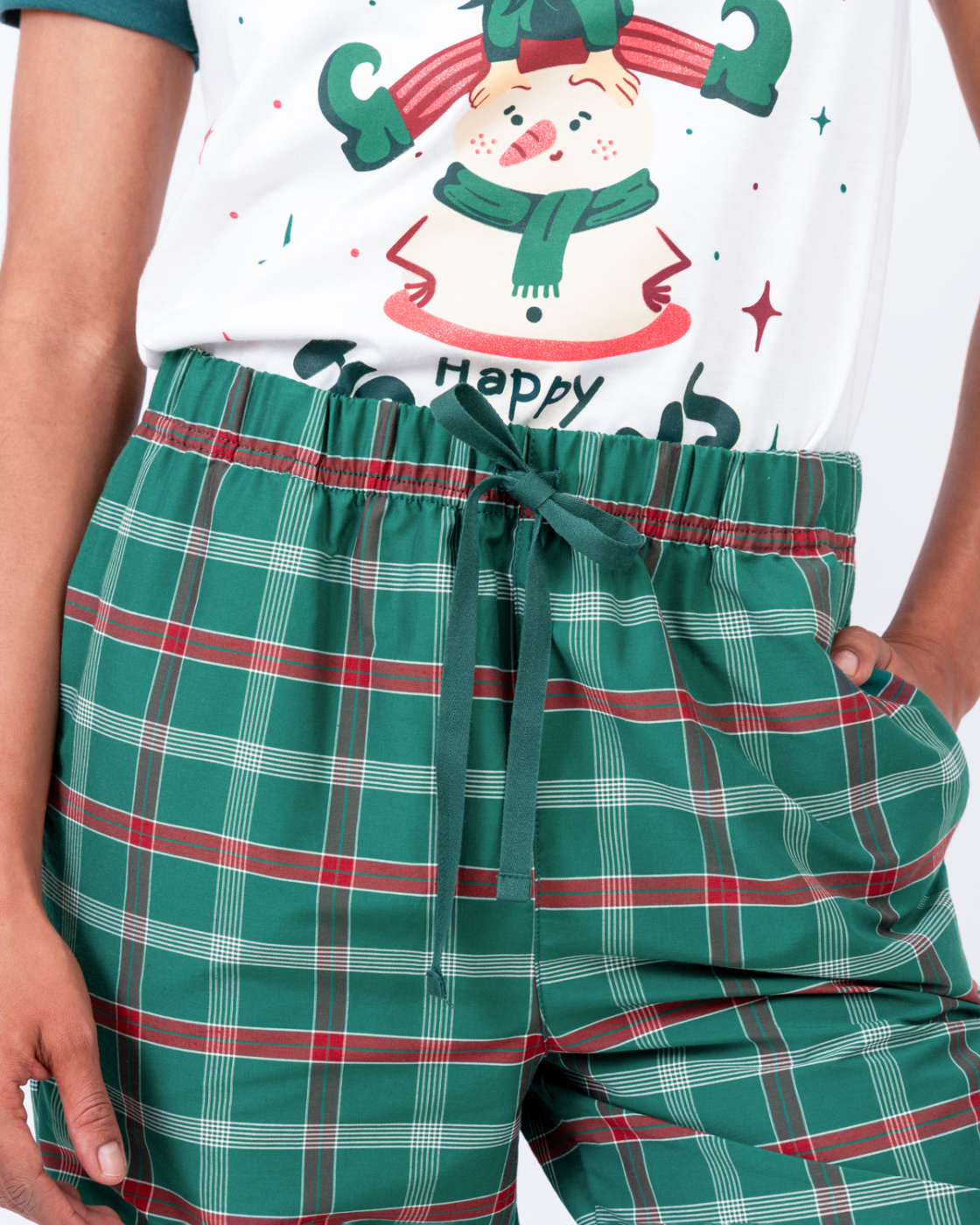Pijama navideña para mujer con camiseta estampada y pantalón a cuadros verdes, suave, cómoda y ligera para un descanso ideal o para disfrutar en familia la Navidad