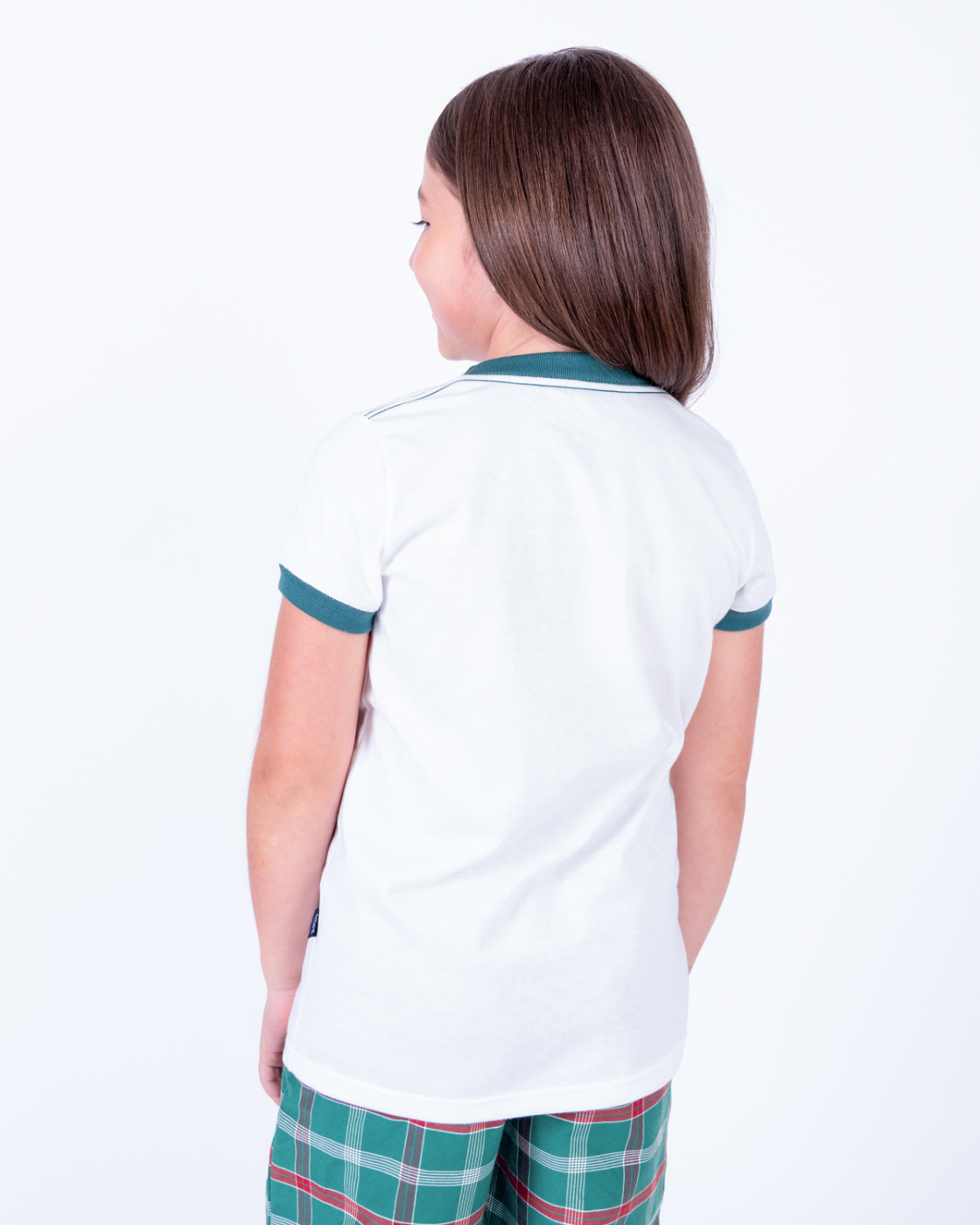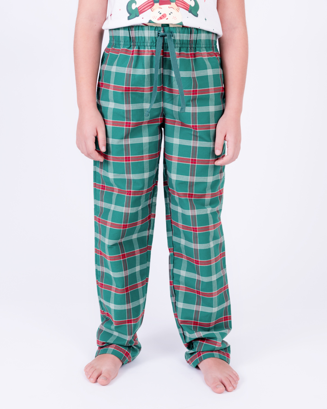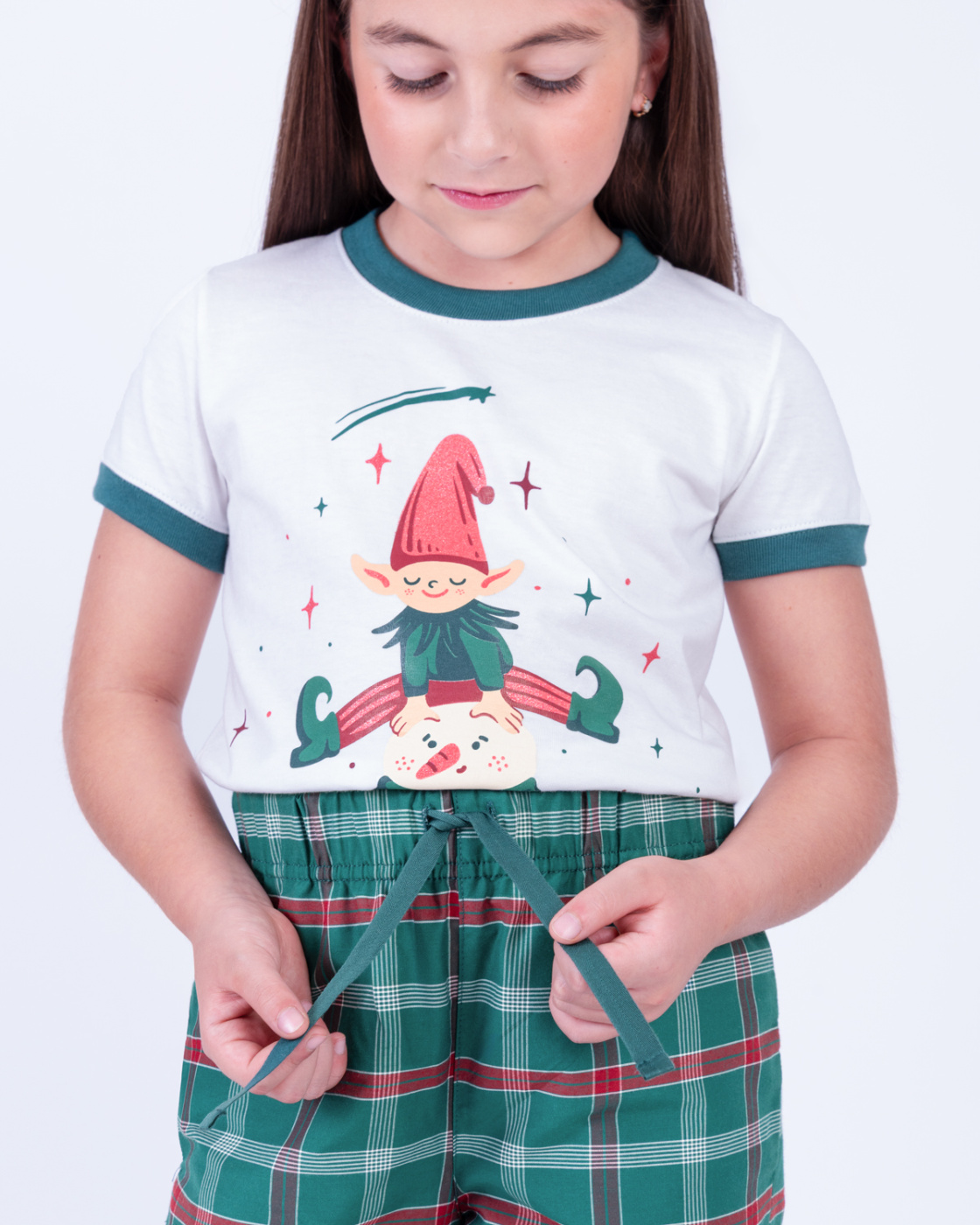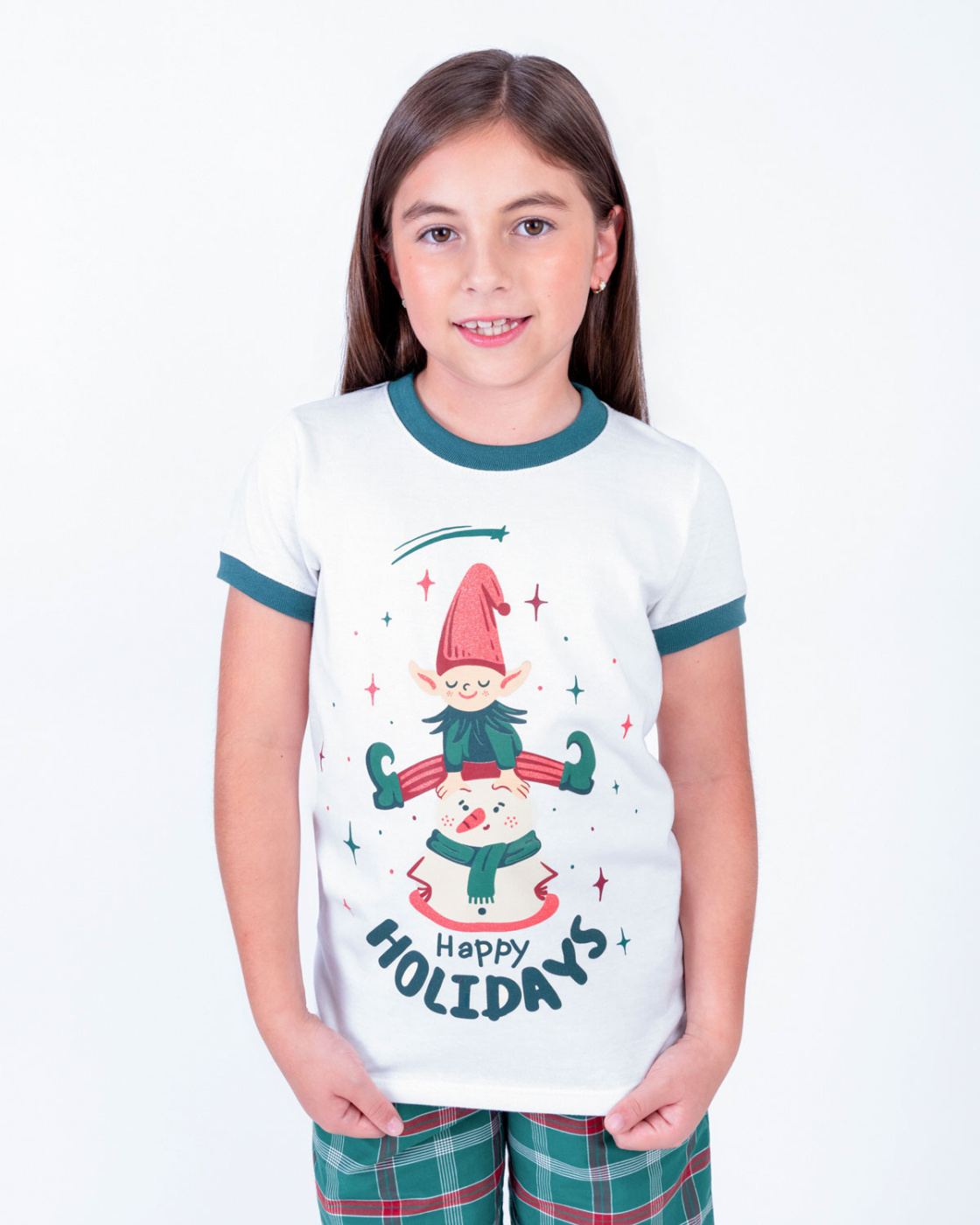 Esta pijama navideña para niña incluye una camiseta blanca de manga corta con bordes verdes y un pantalón a cuadros en tonos rojo y verde. Su tejido suave y liviano brinda la mayor comodidad para disfrutar esta Navidad de la mejor manera. Ideal para combinar con la pijama de mamá, papá o hermanos y vivir juntos la magia de la Navidad.