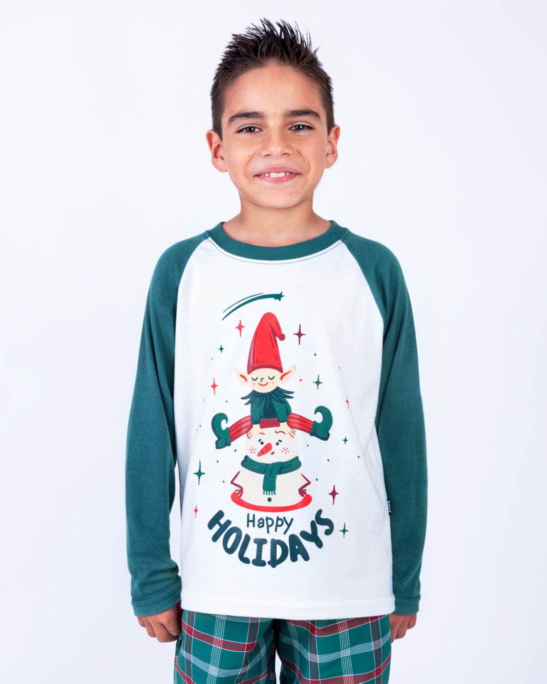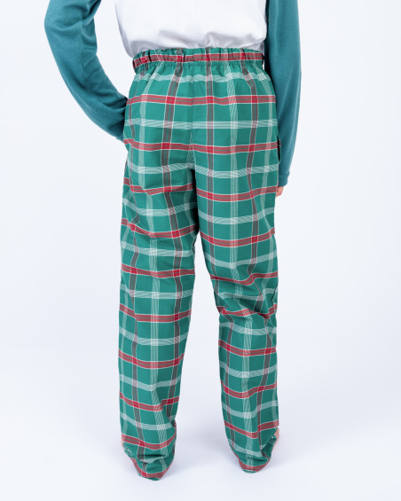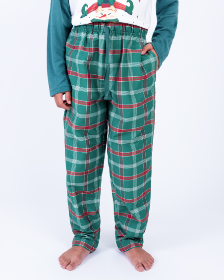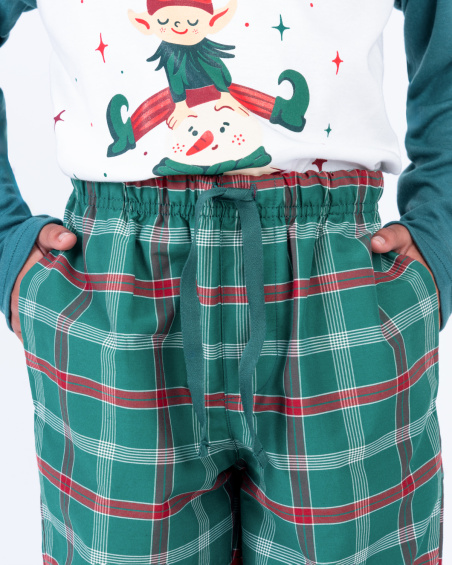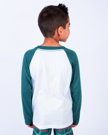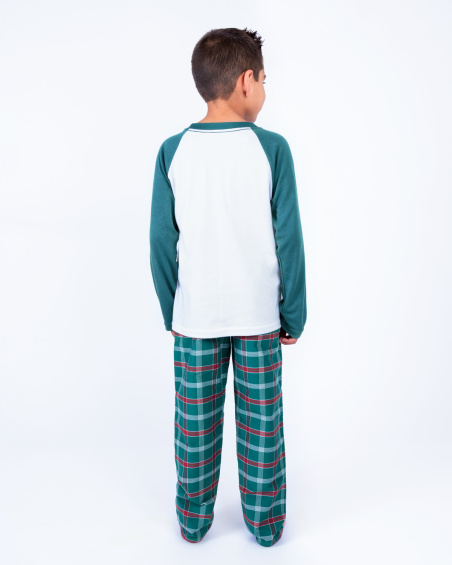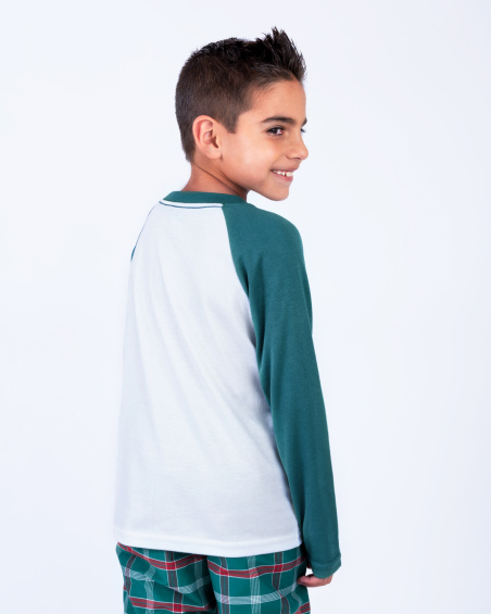 Pijama navideña para niño con camiseta manga larga y pantalón a cuadros verdes. Suave, cómoda y ligera para un descanso ideal o para disfrutar en familia la Navidad