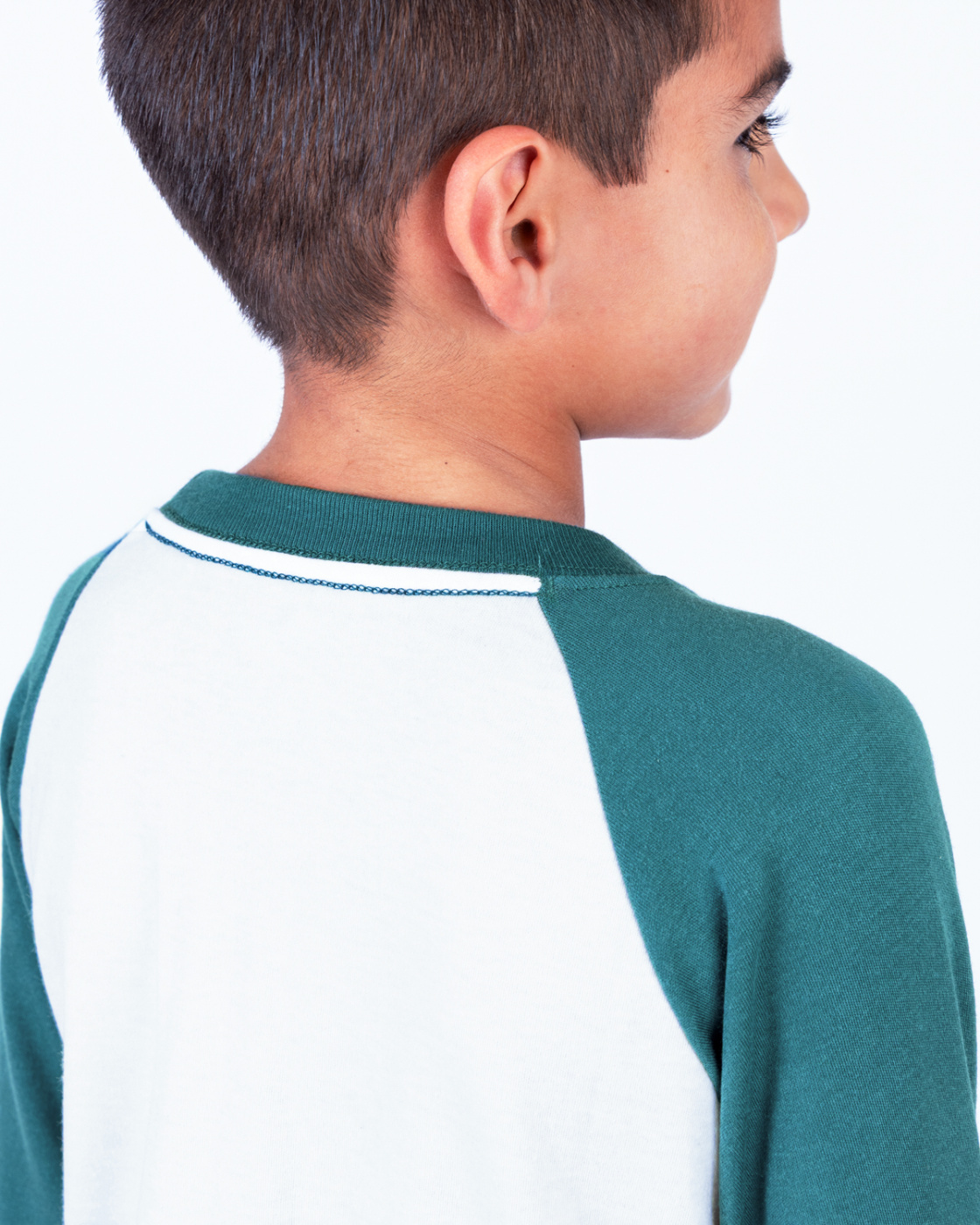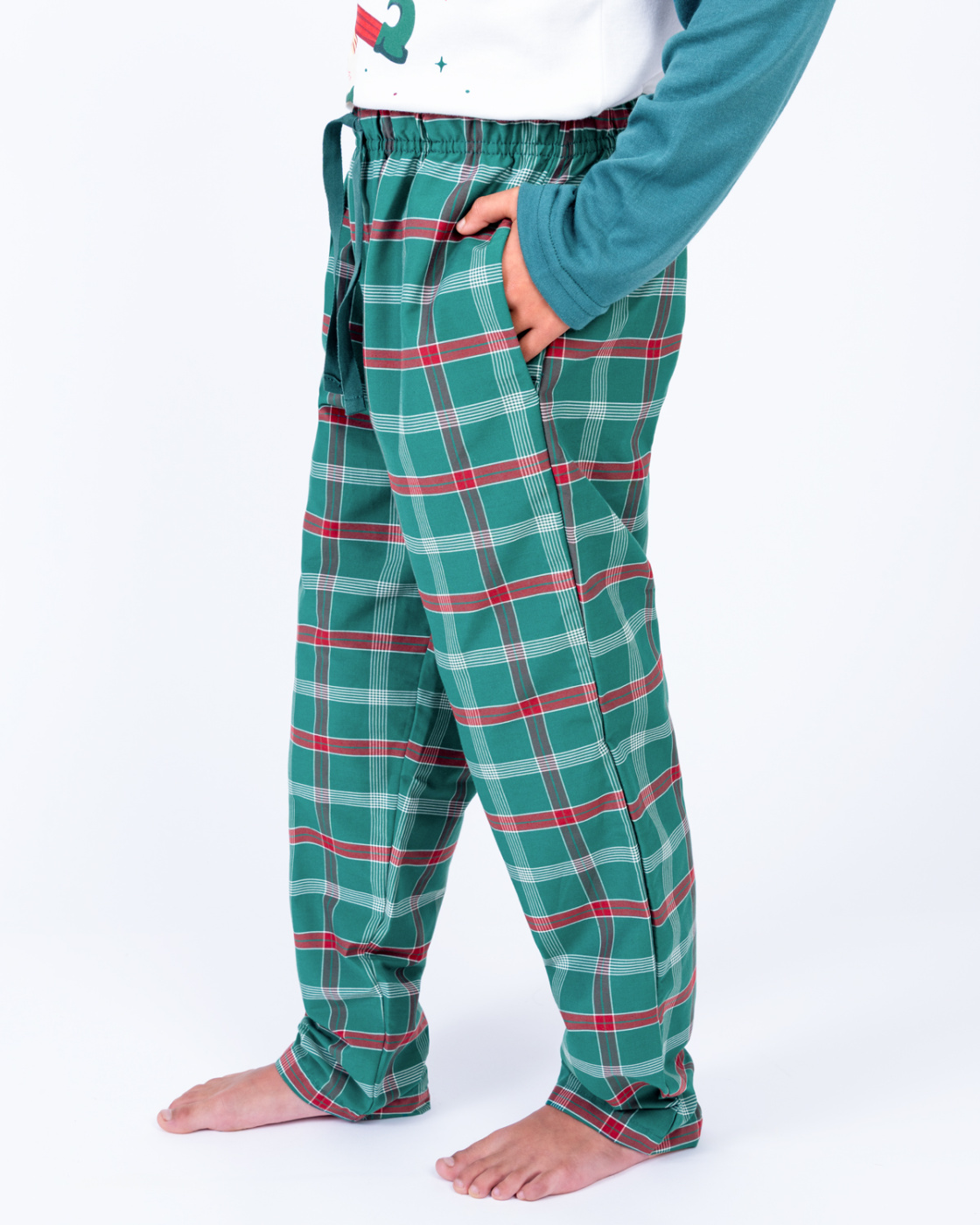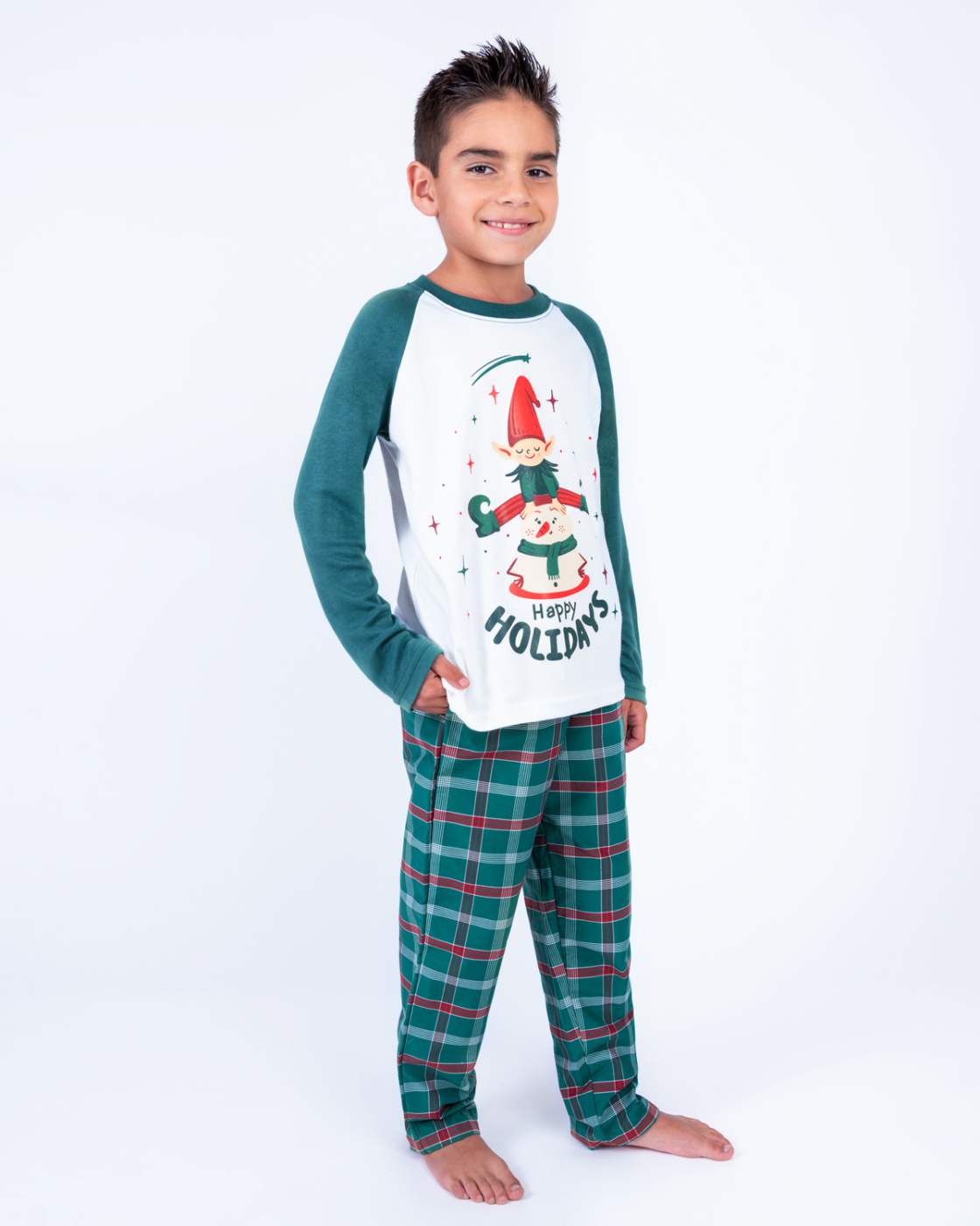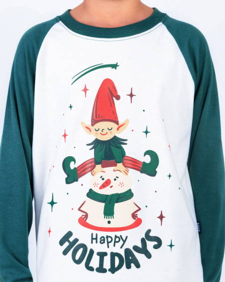 Pijama navideña para niño, cuenta con una camiseta blanca de manga larga y mangas verdes, junto con un pantalón a cuadros en tonos rojo y verde. Su diseño estampado navideño y tejido suave al tacto ofrece comodidad para dormir o disfrutar momentos en familia. Perfecta para coordinar con las pijamas de papá, mamá o hermanos y vivir juntos la magia de la Navidad.