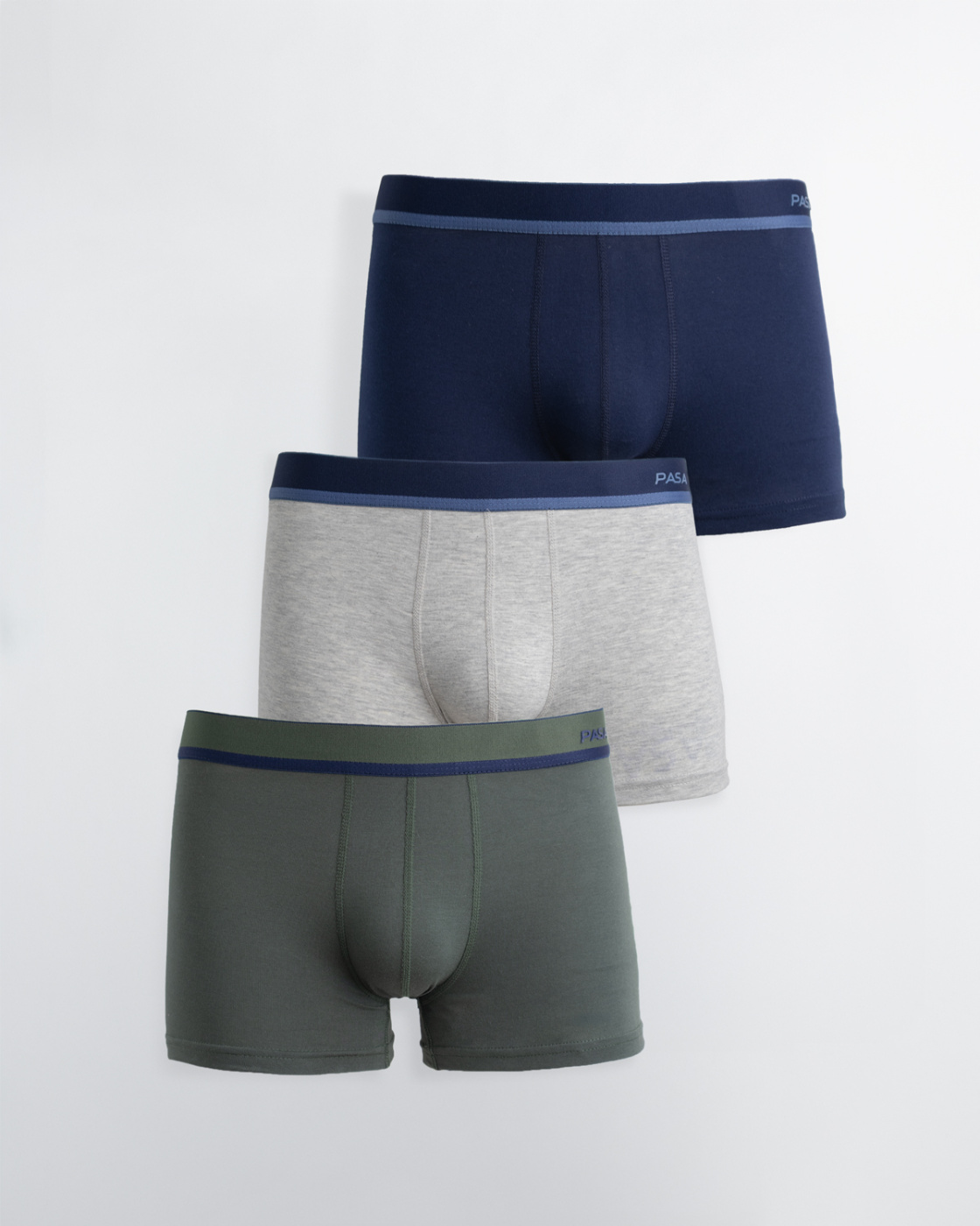 Set de tres bóxers en algodón elástico, colores básicos, cómodo y práctico para uso diario.