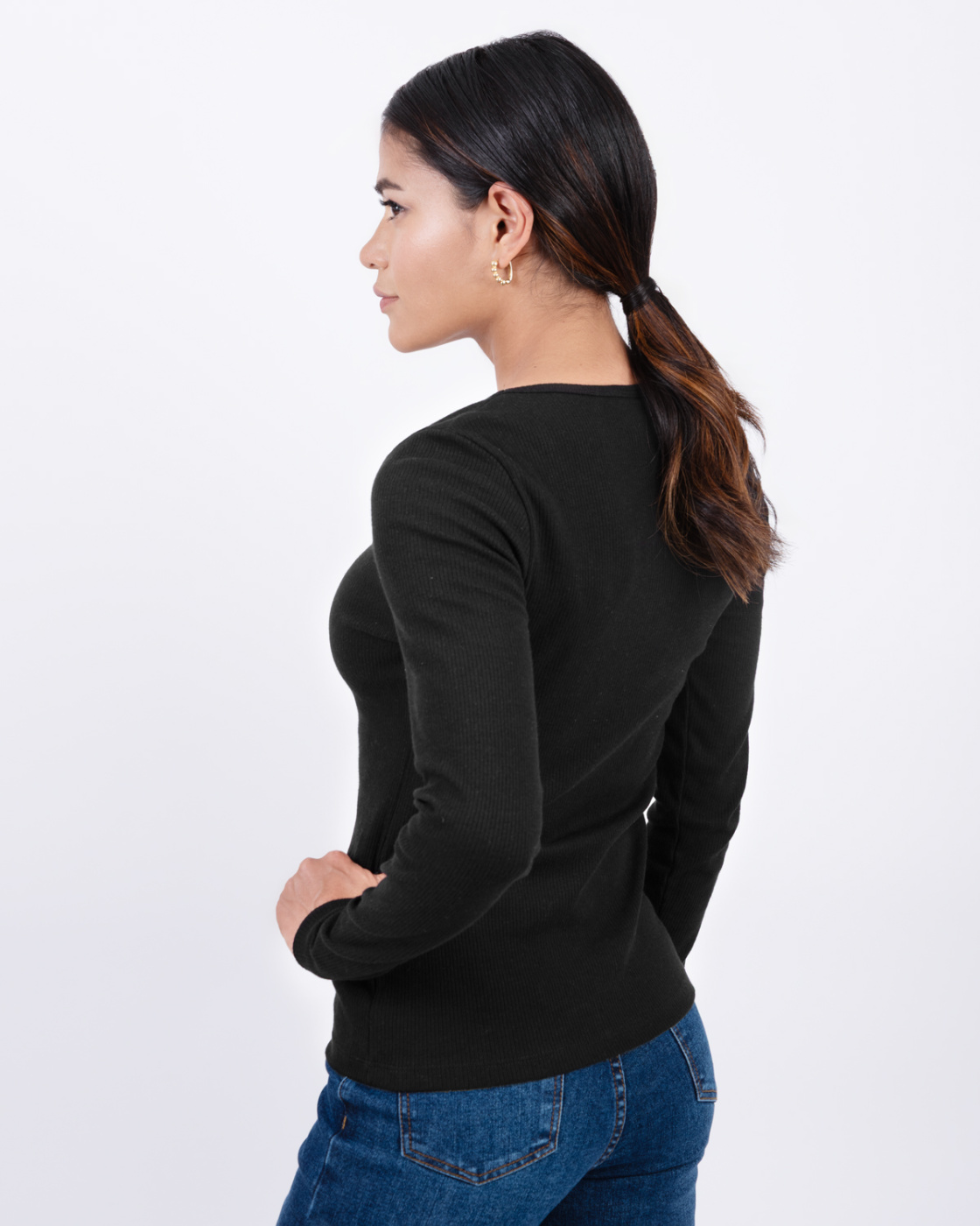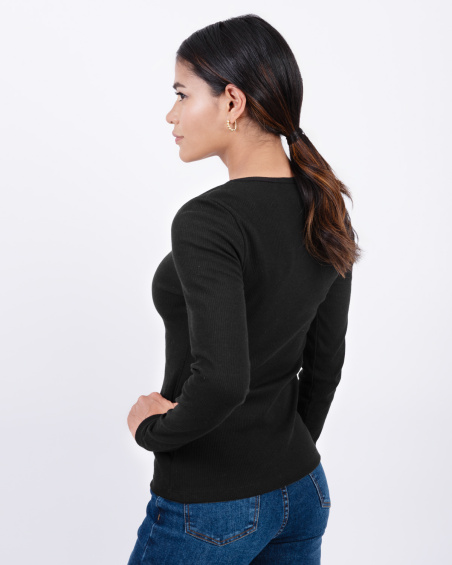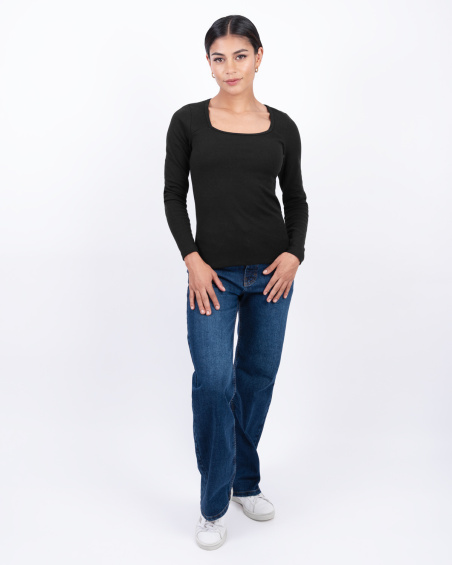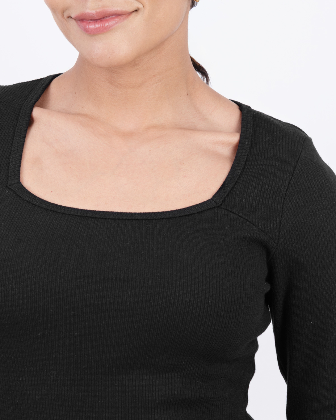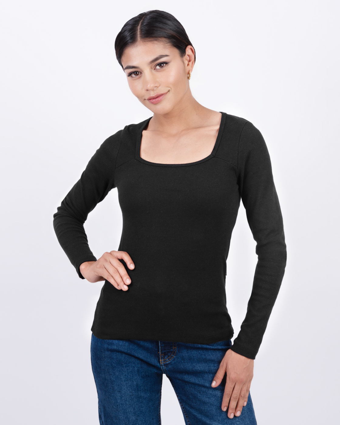 Camiseta manga larga para mujer con cuello cuadrado y textura suave, ideal para looks cómodos en cualquier ocasión.