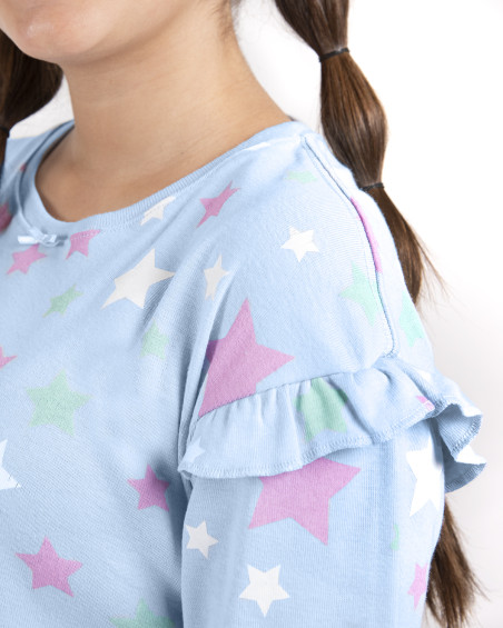 Pijama camiseta manga larga y pantalón con detalle de arandela encarrujada en brazos.
