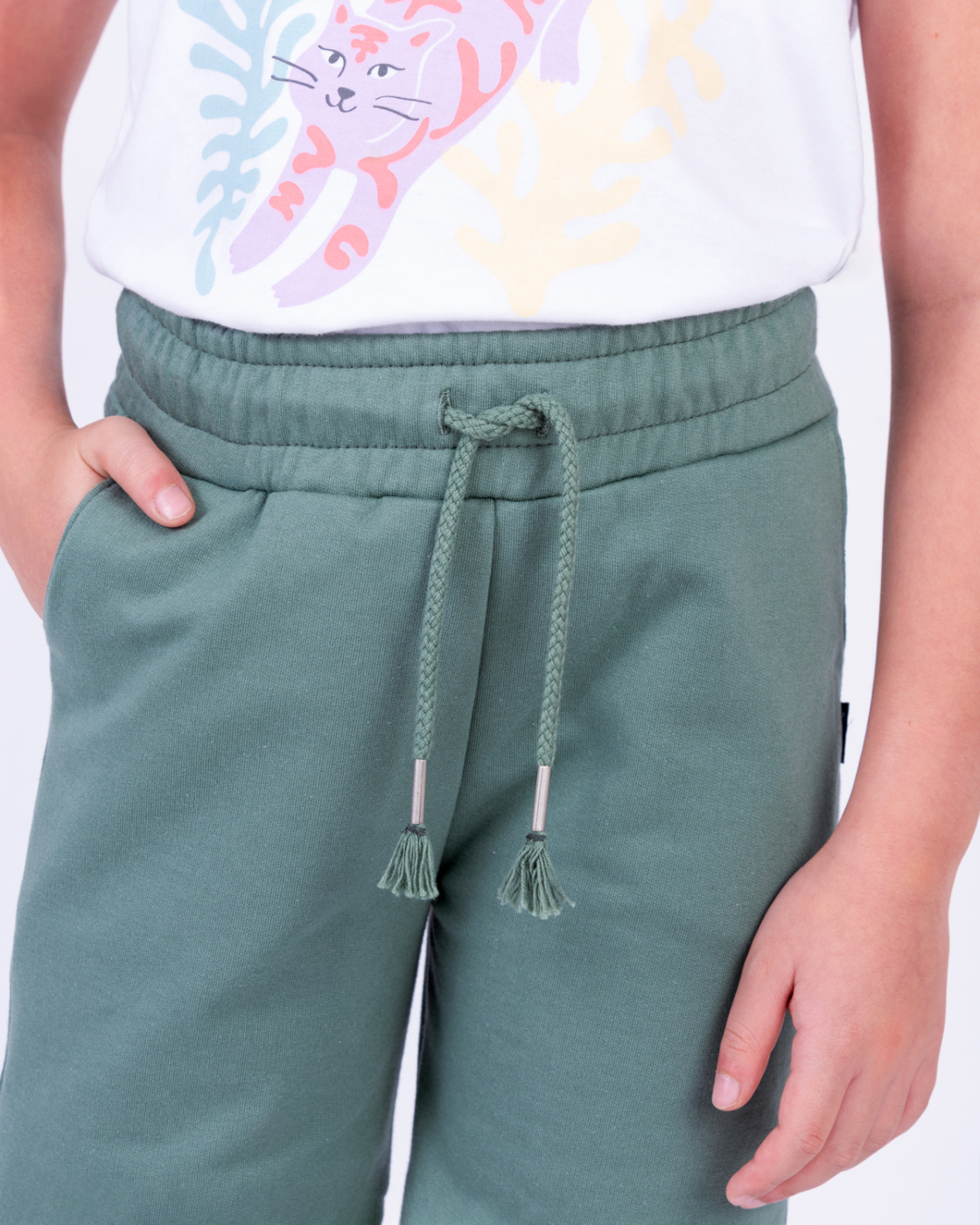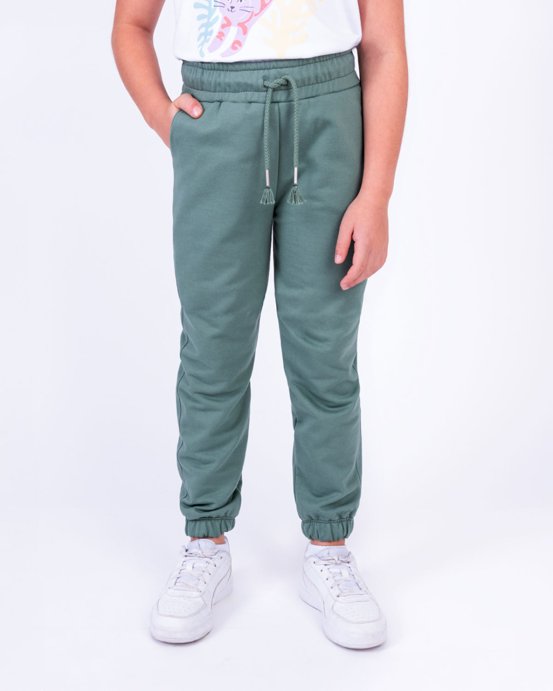Jogger para niña con cintura ajustable, bolsillos laterales y botamangas elásticas para mayor comodidad.